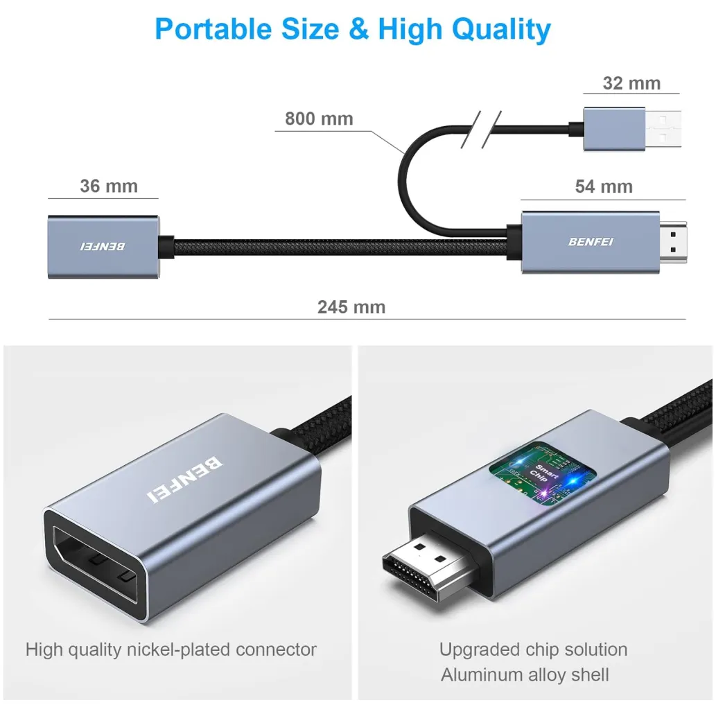 KOMPAKTNA OBLIKA: BENFEI DisplayPort na HDMI adapter poveže računalnik, prenosnik ali naprave z DisplayPort priključkom z monitorjem, projektorjem ali TV-jem s HDMI vhodom. Ta lahek pripomoček lahko pospravite v žep za predstavitve ali razširitev namizja na monitor ali TV.