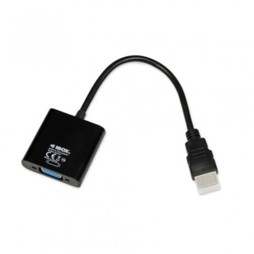 iBox IAHV01. Priključek 1: HDMI tipa A (standard), Priključek 2: VGA (D-Sub), Priključek 1 Spol: moški. Količina v pakiranju: 1 kos(i), vrsta pakiranja: pretisni omot. Širina: 105 mm, Globina: 25 mm, Višina: 20 mm.