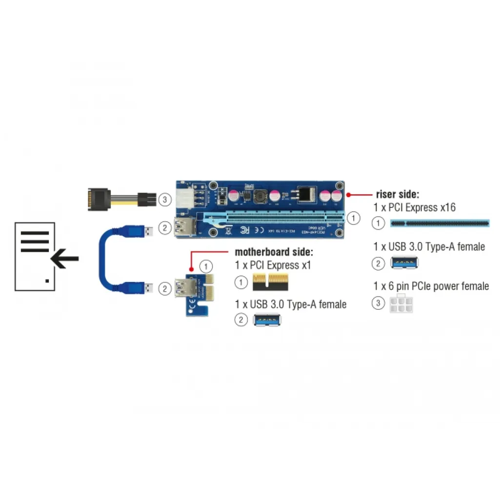 Delockovo kartico PCI Express Riser lahko priključite v katero koli režo PCI Express x1 na matični plošči. Reža x16 PCI Express se lahko nato namesti v drug položaj v ohišju. To pomeni, da lahko grafično kartico upravljate v vsaki posamezni reži PCIe na matični plošči, tudi če je grafična kartica širša od ene same reže. Z uporabo več riser kartic lahko na eni matični plošči hkrati deluje več grafičnih kartic, npr. B. za rudarjenje kriptovalut, kot so Bitcoin, Ethereum ali Zcash.