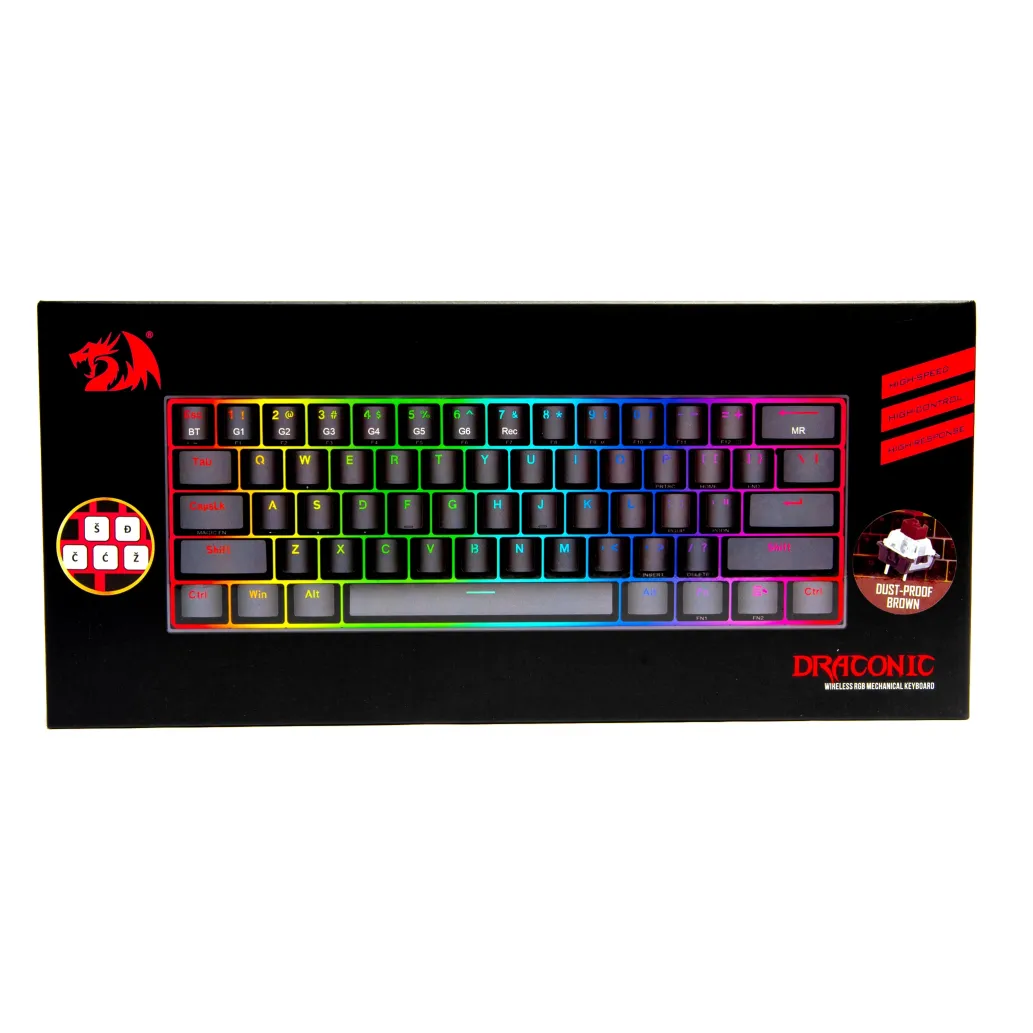 Redragon K530 Draconic je brezžična mehanična tipkovnica, ki ima 61 tipk in RGB osvetlitev, namenjena pa je za uporabo na PC, tabličnih računalnikih ali telefonih. Tipkovnica ima 5.0 bluetooth povezavo in baterijo 2400 mAh. Tipkovnico lahko povežete s PC, tabličnim računalnikom ali pa tudi na telefonom, brez uporabe kablov. Poleg brezžične povezave je tukaj tudi žični priključek, saj lahko pri igranju iger pride do tako imenovanega “wireless lagga”, zato imamo tukaj tudi žično povezavo.