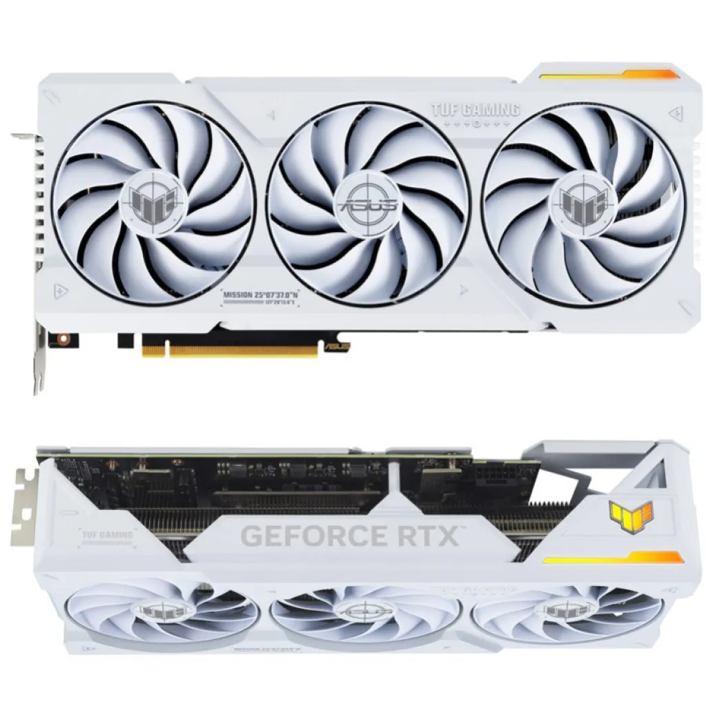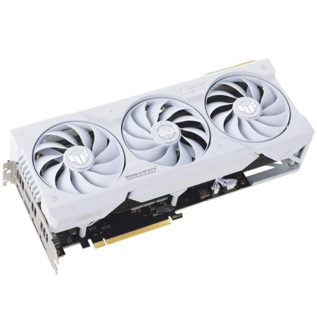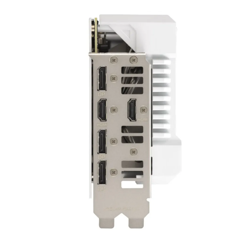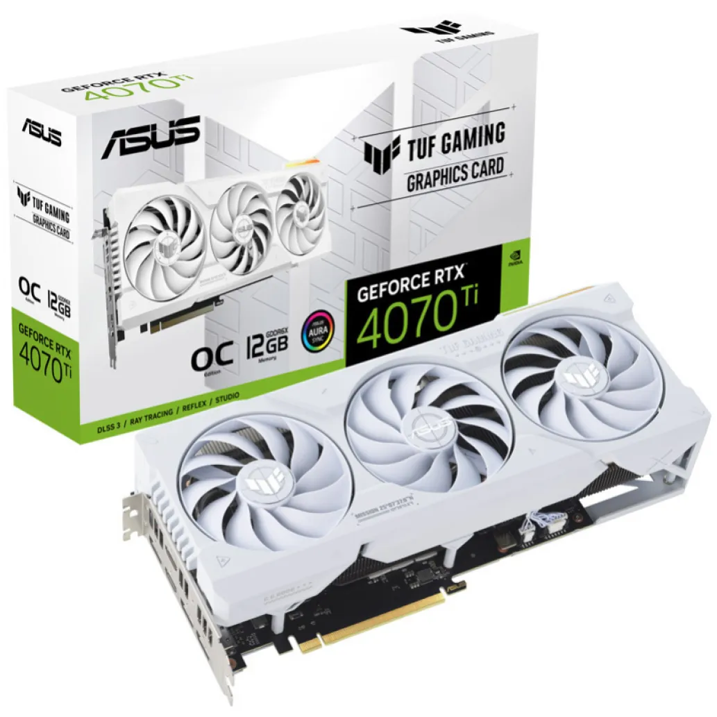 ASUS TUF Gaming TUF-RTX4070TI-O12G-WHITE-GAMING. Družina grafičnega procesorja: NVIDIA, GPU: GeForce RTX 4070 Ti. Pomnilnik diskretne grafične kartice: 12 GB, Vrsta pomnilnika grafične kartice: GDDR6X, Širina pomnilniškega vmesnika: 192 bitov. Največja ločljivost: 7680 x 4320 slikovnih pik. Različica OpenGL: 4.6. Vmesnik: PCI Express 4.0. Hlajenje: Aktivno, Število ventilatorjev: 3 ventilatorji, Barve osvetlitve: Multi.