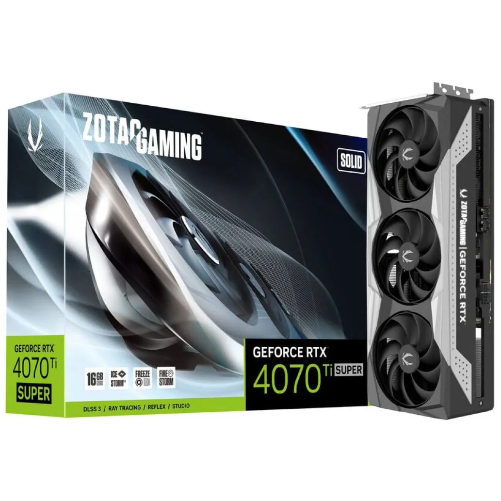 Visoko grafično zmogljivost ZOTAC Gaming GeForce RTX 4070 Ti Super Solid poganjata grafični procesor z največjo pospešeno takto 2610 MHz in 16 GB pomnilnika GDDR6X z efektivno taktno hitrostjo 21000 MHz. ZOTAC Gaming GeForce RTX 4070 Ti Super Solid vzdržuje nizke temperature z ZOTAC-ovim posebej razvitim hladilnim sistemom s tremi ventilatorji.