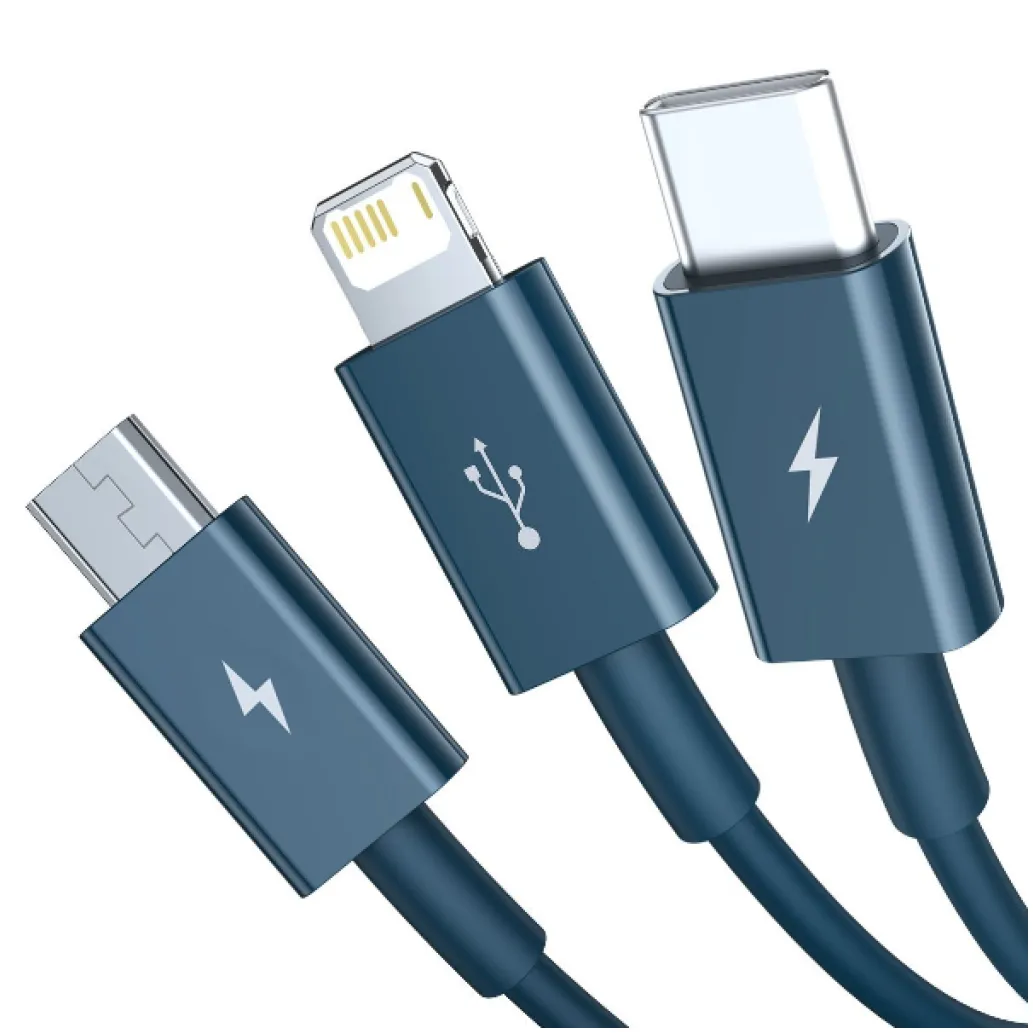 Baseus 3v1 kabel omogoča hitro polnjenje telefona. Omogoča tudi prenos datotek s hitrostjo do 480 MB/s. Trpežen in odporen na poškodbe – dolgo vam bo odlično služil. V kompletu boste našli tudi praktičen trak, ki olajša shranjevanje kabla in preprečuje zapletanje. Kar 3 priključki – micro USB, USB-C in lightning, zagotavljajo široko združljivost izdelka in omogočajo polnjenje več naprav hkrati.