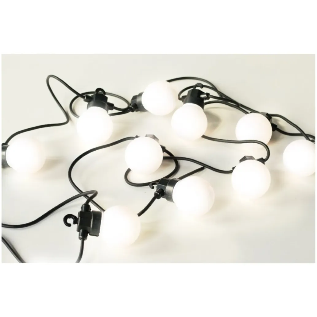 Elegantna veriga LED žarnic z 10 belimi žarnicami za prijetno toplo belo svetlobo. Zahvaljujoč vodoodporni škatli za akumulatorje se veriga lahko uporablja tako v zaprtih prostorih kot na prostem.