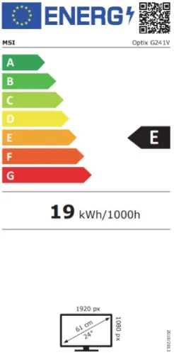 MSI Optix G241V E2. Diagonala zaslona: 60,5 cm (23,8 palca), ločljivost zaslona: 1920 x 1080 slikovnih pik, vrsta HD: Full HD, tehnologija zaslona: LED, odzivni čas: 1 ms, izvorno razmerje stranic: 16: 9, vidni kot, vodoravno: 178 ° , vidnim kotom, vertikalni: 178 °. VESA nosilec. Barva izdelka: črna