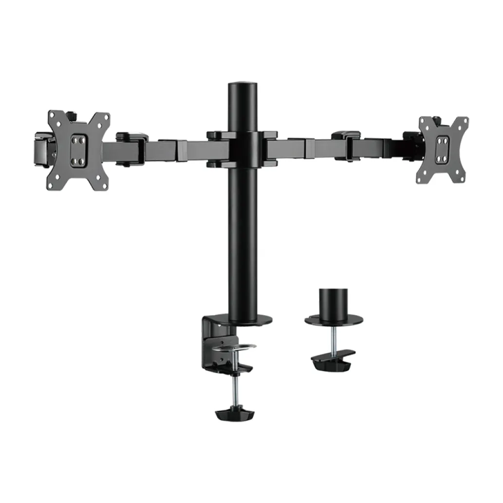 Ustvarite urejeno, ergonomsko in profesionalno delovno okolje z visokokakovostnim dvojnim nosilcem za monitorje. Nosilec omogoča namestitev dveh zaslonov velikosti od 17 do 32 palcev ter je zasnovan za uporabnike, ki potrebujejo več delovne površine, boljšo preglednost in prilagodljivost pri delu ali igranju.