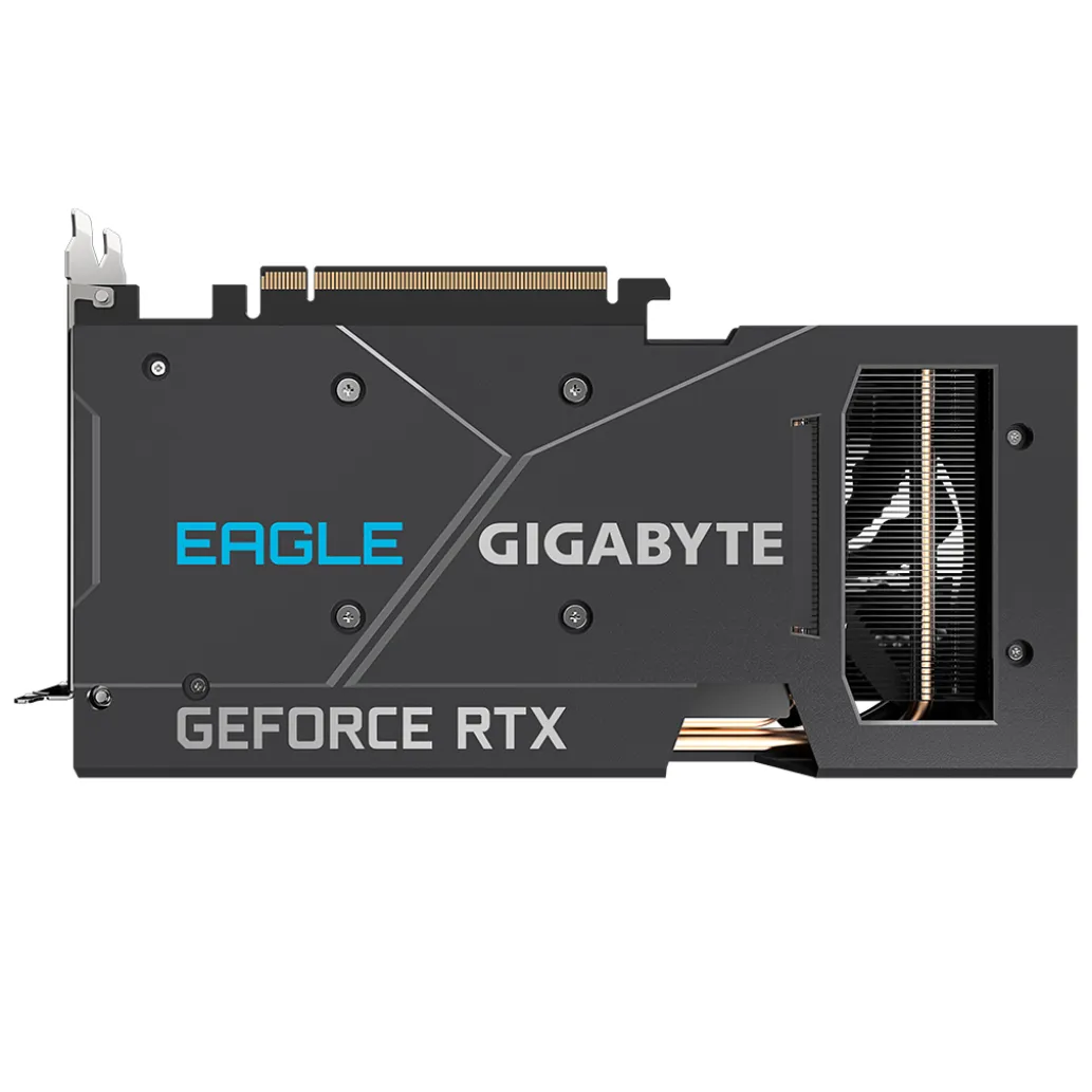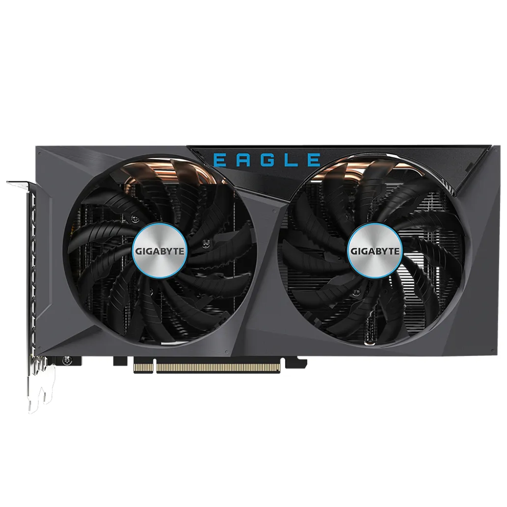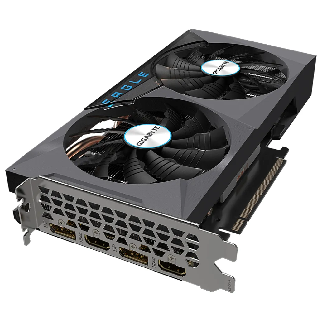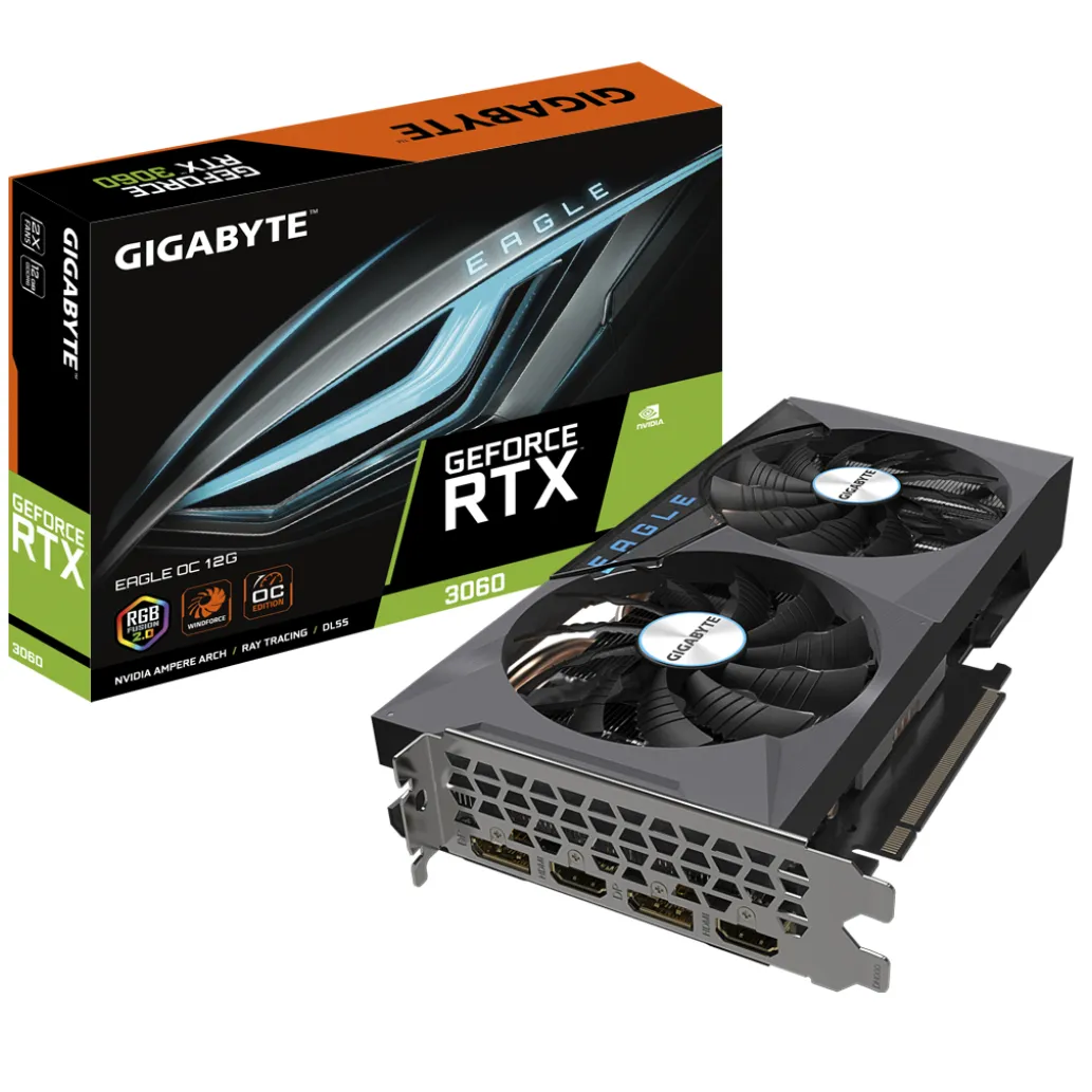 Gigabyte GeForce RTX 3060 EAGLE OC 12G (rev. 2.0). Družina grafičnega procesorja: NVIDIA, GPU: GeForce RTX 3060. Pomnilnik diskretnega grafičnega adapterja: 12 GB, Vrsta pomnilnika grafične kartice: GDDR6, Širina pomnilniškega vmesnika: 192-bit, Frekvenca pomnilnika: 15000 MHz. Največja ločljivost: 7680 x 4320 slikovnih pik. Različica DirectX: 12 Ultimate, različica OpenGL: 4.6. Vmesnik: PCI Express x16 4.0. Hlajenje: Aktivno, Število ventilatorjev: 2 ventilatorja, Barve osvetlitve: Več