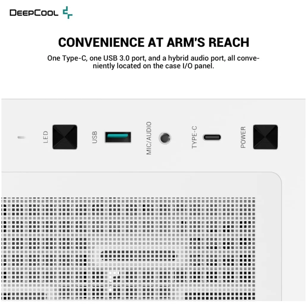 DeepCool CH560 DIGITAL WH. Faktor oblike: Midi Tower, Tip: PC, Barva izdelka: Bela. Postavitev napajalnika: Tla, Podprti faktorji oblike napajalnika: ATX, PS2. Nameščeni ventilatorji (spredaj): 3x 140 mm, Premer podprtih sprednjih ventilatorjev: 120.140 mm, Nameščeni ventilatorji zadaj: 1x 120 mm. Podprte velikosti trdih diskov: 2.5,3.5″. Širina: 230 mm, Globina: 458 mm, Višina: 471 mm.