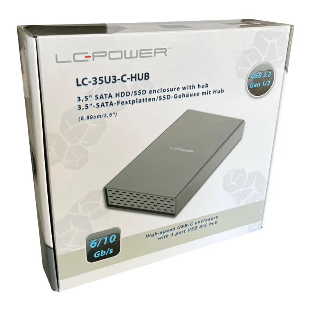 LC Power LC-35U3-C-HUB. Vrsta izdelka: ohišje za trdi disk Število podprtih pogonov za shranjevanje: 1, Velikost shranjevalnega pogona: 3,5 palca, Podprti vmesniki shranjevalnih pogonov: SATA, Serial ATA II, Serial ATA III. Hitrost prenosa podatkov: 10 Gbps. Barva izdelka: Črna. Priključek USB: USB Type-C
