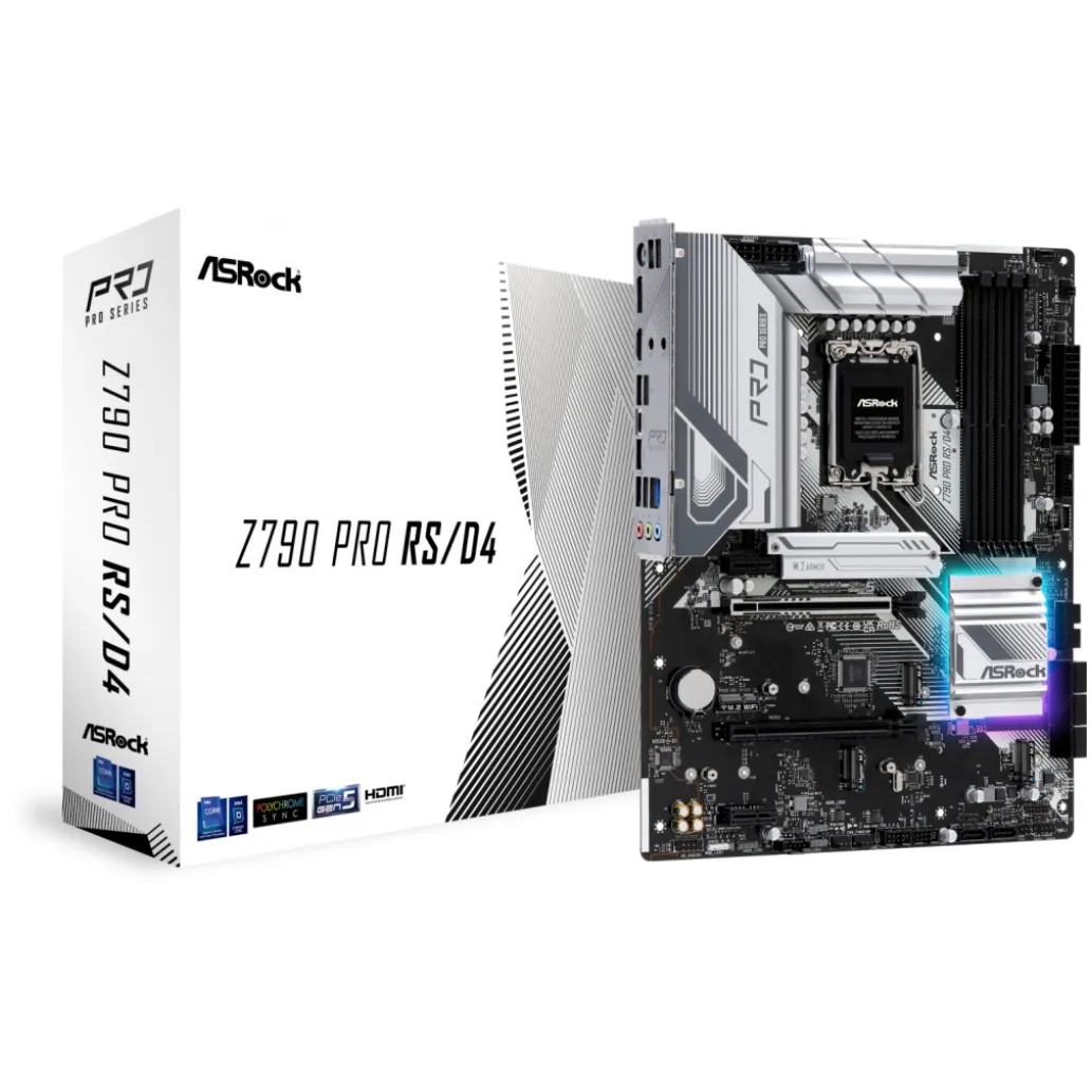 Asrock Z790 Pro RS/D4. Proizvajalec procesorja: Intel, Podnožje procesorja: LGA 1700, Združljivi procesorji: Intel® Core™ i5, Intel® Core™ i7, Intel® Core™ i9. Podprt pomnilnik: DDR4-SDRAM, največji pomnilnik RAM: 128 GB, vrsta pomnilnika: DIMM. Podprti vmesniki pomnilniških pogonov: M.2, SATA III, Podprti pogoni za shranjevanje: HDD & SSD, ravni RAID: 0, 1, 5, 10. Vrsta vmesnika Ethernet: 2.5 Gigabit Ethernet, LAN krmilnik: Dragon RTL8125BG. Komponenta za: PC, Faktor oblike matične plošče: ATX, Družina čipov matične plošče: Intel.