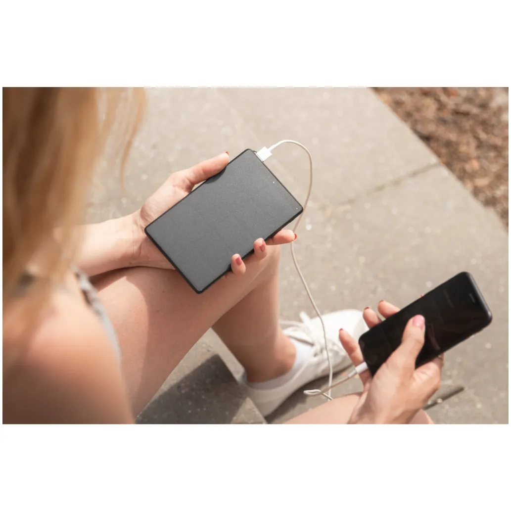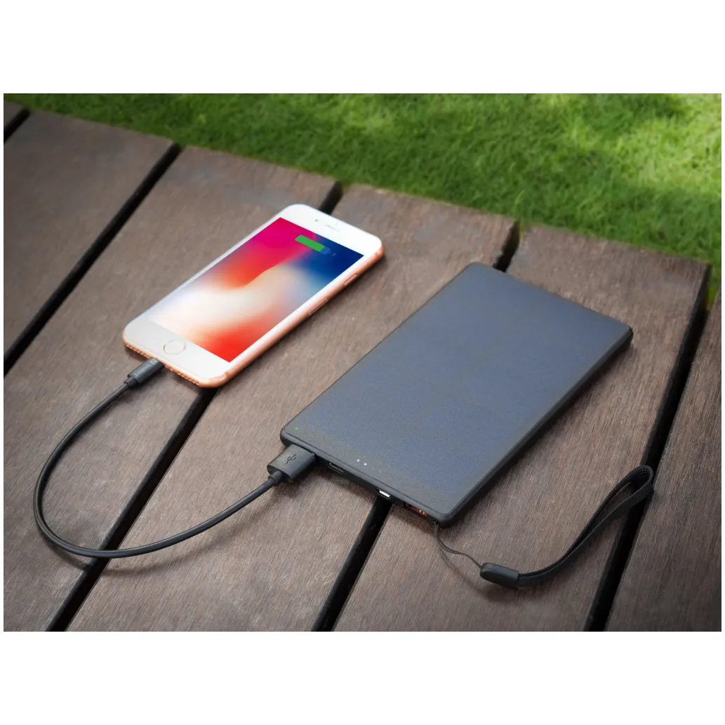Prenosna baterija je opremljena z učinkovito solarno ploščo, izdelano v ZDA, ki ustvari dovolj energije za dodatno polnjenje vašega pametnega telefona na sončni dan.