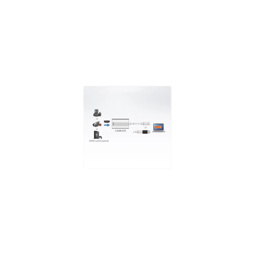 “CAMLIVE” je naprava za zajem videa HDMI UVC za pošiljanje nešifriranega videa HDMI na vaš prenosnik USB-C ali Thunderbolt 3 (ali USB-A s priloženim adapterjem). Je skladen z najnovejšo specifikacijo USB 3.1 Type-C.