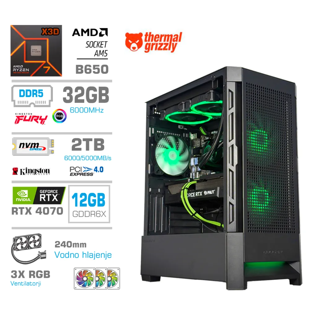 Računalnik MEGA MT S8 R7-7800X3D/RTX4070/32GB-DDR5/2TB-4.0/750W/Brez OS/črna RGB + Estetski napajalni kabli [Zelena / Črna]