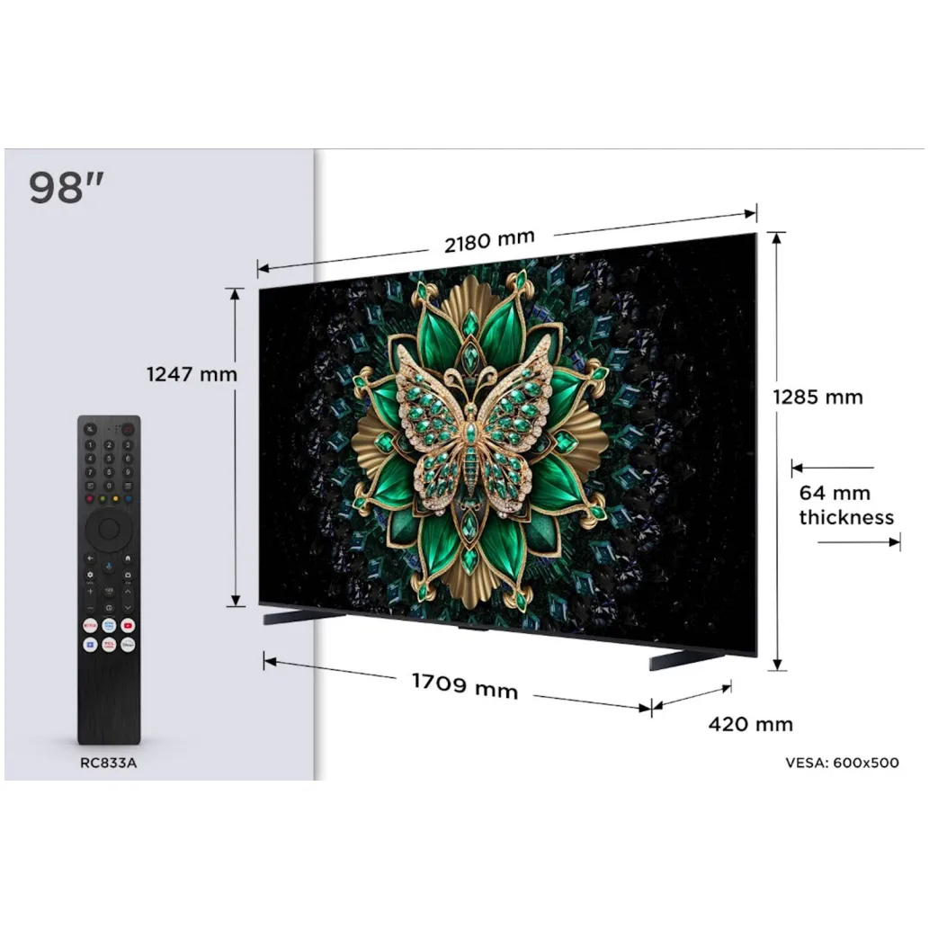 TCL 98C61K je 98-palčni 4K QD-Mini LED televizor, ki ponuja izjemno sliko z globokimi črnimi toni in natančnimi barvami. Z Dolby Vision IQ, HDR10+, in 512 conami Precise Dimming zagotavlja osupljiv kontrast in podrobnosti. 144Hz Motion Clarity Pro omogoča vrhunsko kakovost slike brez zameglitve gibanja, medtem ko Onkyo 2.1 zvok s Dolby Atmos zagotavlja kinematografsko zvočno izkušnjo. Android TV z Google TV vam omogoča dostop do vsebin po vaši izbiri.