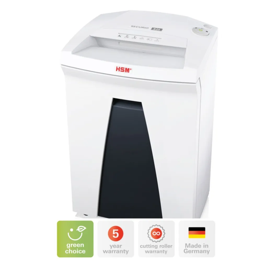 – širina odprtine 240 mm- kapaciteta 25-27 listov 80gsm- razrez na trakove 5,8mm- reže sponke, kartice, CD-je- varnostni razred P-2/ O-2/ T-2/ E-2- prostornina koša 34l- dimenzije: 395x317x605mm- teža: 15 kg- funkcija samodejnega vklopa-izklopa, rezanja naprej in v vzratni smeri- v mirovanju se električna energija ne porablja- tiho delovanje – varnostna loputa- koleščki za lažjo mobilnost- garancija doživljenska na nože in 5 let na delovanje- proizvedeno v Nemčiji- rezalni mehanizem deluje neprekinjenoOlje za rezalne nože – za dolgo življenjsko dobo rezalnika