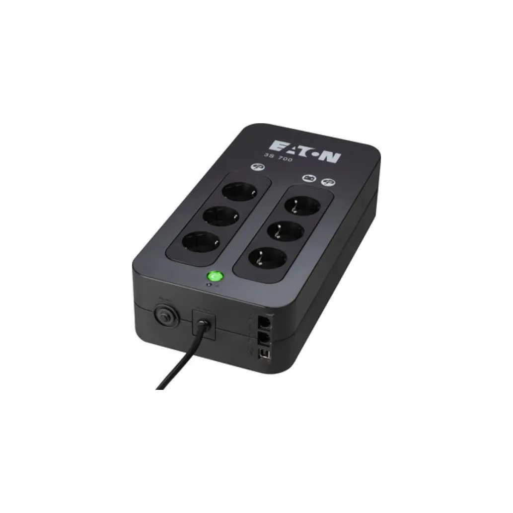 Eaton 3S700D. Topologija UPS: Standby (Offline), Izhodna zmogljivost: 0,7 kVA, Izhodna moč: 420 W. Število AC vtičnic: 8 AC vtičnic. Tehnologija baterije: zapečatena svinčena kislina (VRLA). Barva izdelka: Črna, Bela, Dolžina kabla: 1,5 m, Varnost: IEC 62040-1; IEC 62040-2 C2; IEC 62040-3; IEC 62040-4; IEC 61643-11. Širina: 335 mm Globina: 170 mm Višina: 86 mm