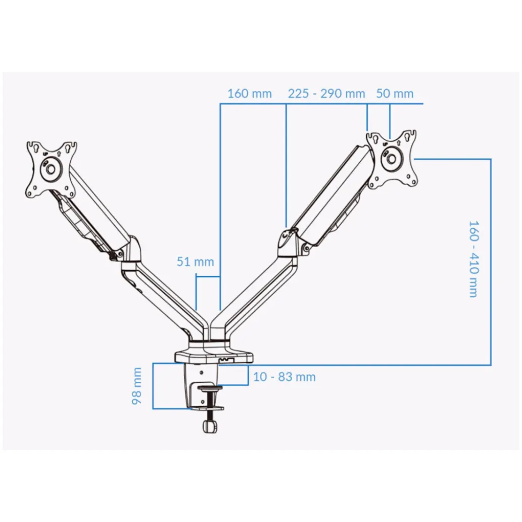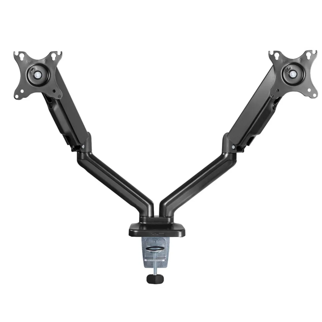 UVI DESK DVOJNI HITRO NASTAVLJIV NAMIZNI NOSILEC ZA MONITOR Eleganten, izjemno močan, stabilen in hitro nastavljiv UVI VESA dvojni namizni premium nosilec iz aluminija bo odpravil nered na vaši mizi. Vsaka roka vzdrži težo do 9 kilogramov in je primerna za monitorje velikosti od 17″ do 32″. Omogoča nagibanje in obračanje monitorja, nastavite jih lahko tudi vertikalno hkrati pa kabelska sponka na roki poskrbi za eleganten videz. Zaradi posebne zasnove roki omogočata hitro in enostavno prilagajanje pozicije monitorja v vse smeri. UVI VESA dvojni namizni premium nosilec za monitor je izdelan iz kakovostnih materialov in zagotavlja dolgo življenjsko dobo. Z njim boste dosegli večjo prilagodljivost in eleganco vašega delovnega prostora.